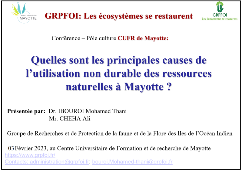 Elle sera présentée par Dr. IBOUROI Mohamed Thani et Mr. CHEHA Ali du Groupe de Recherches et de Protection de la Faune et de la Flore des Îles de l’Océan Indien GRPFOI),